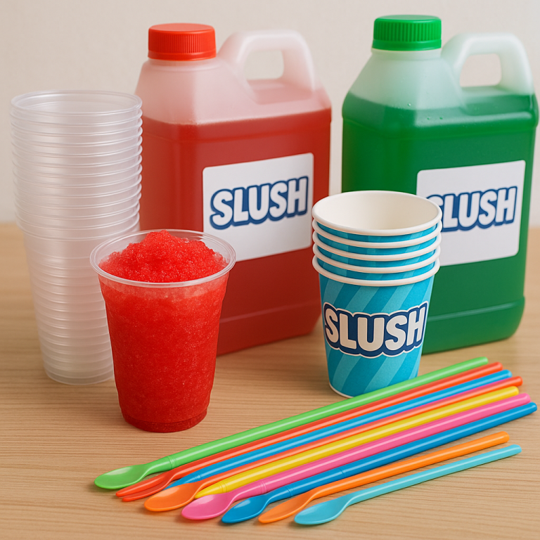 Zu unseren Slushmaschinen bieten wir das passende Zubehör an – von Slushbechern aus Plastik oder Pappe über klassische Strohhalme bis hin zu Strohhalmlöffeln.