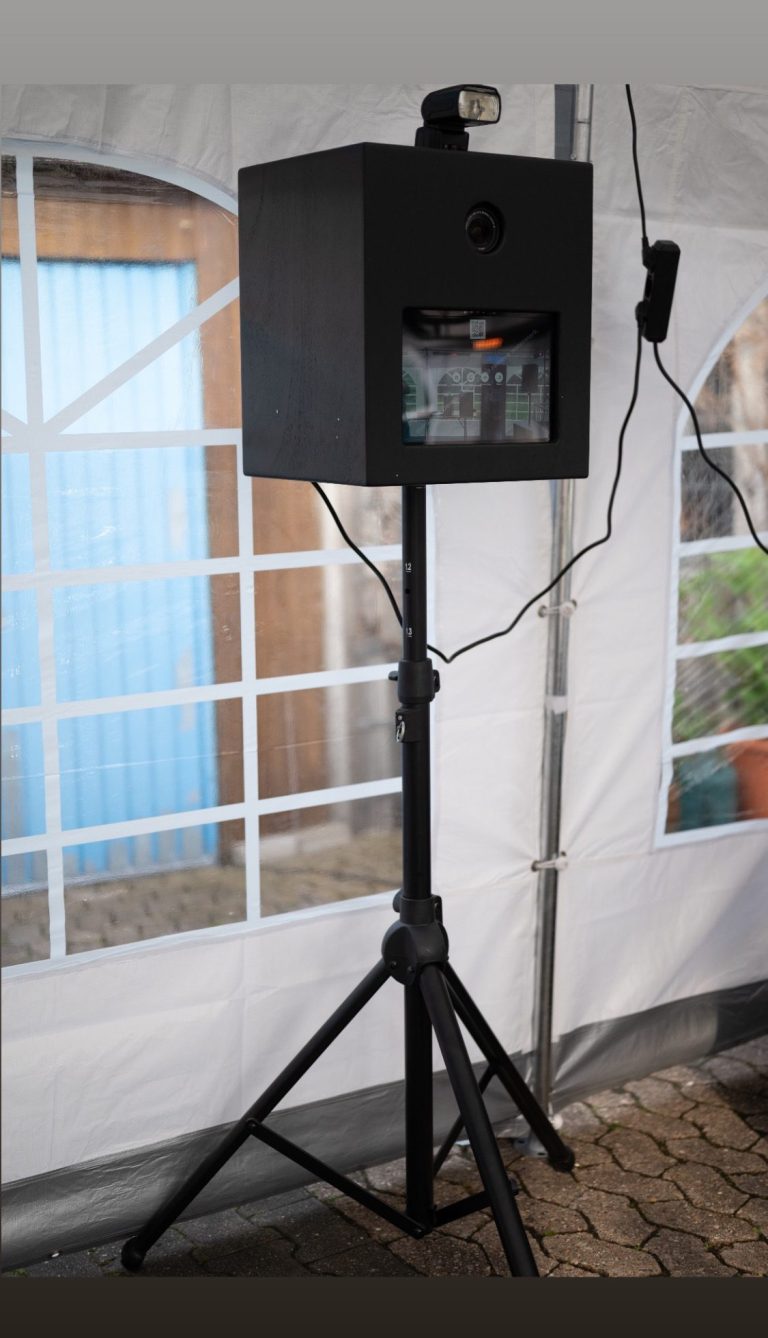 Unsere Fotobox Classic – liebevoll aus Holz gefertigt, ausgestattet mit einer hochwertigen Kamera und einem benutzerfreundlichen Interface – steht stabil auf einem edlen Dreibein-Gestell und macht jede Party unvergesslich.