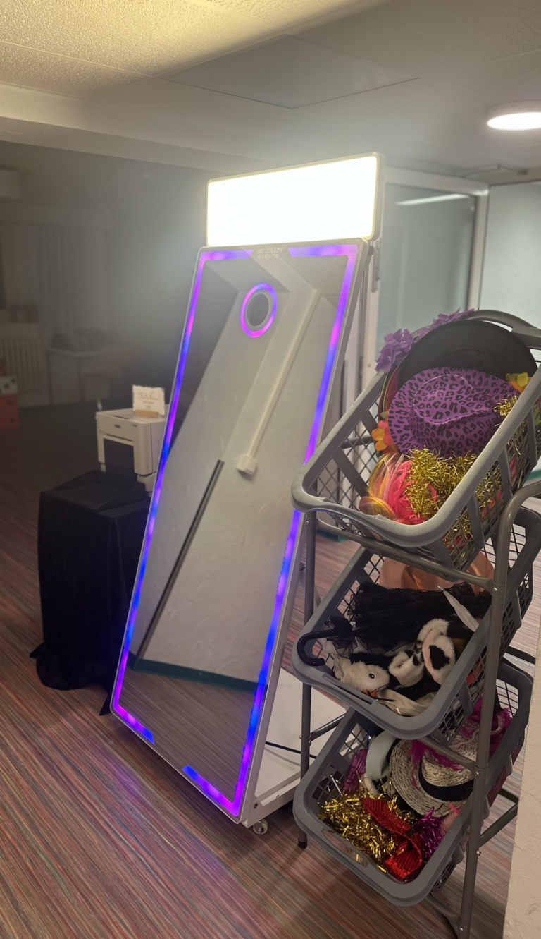 Unsere Spiegel-Fotobox – gefertigt aus leichtem Aluminium und ausgestattet mit einem beeindruckenden, großen Spiegeldisplay – zieht auf jeder Feier alle Blicke auf sich.