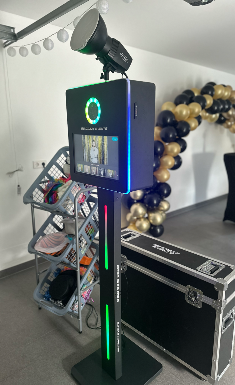 Unsere Fotobox Premium – gefertigt aus leichtem Metall, ausgestattet mit einem leistungsstarken PC und einer hochwertigen Kamera – fügt sich dank stilvoller LED-Elemente perfekt in jede Location ein.