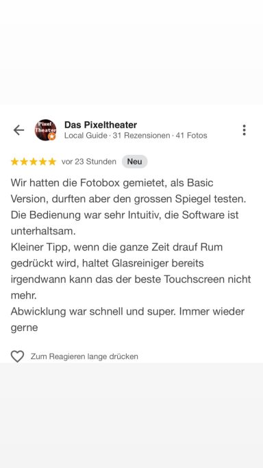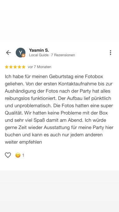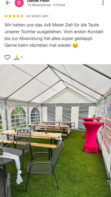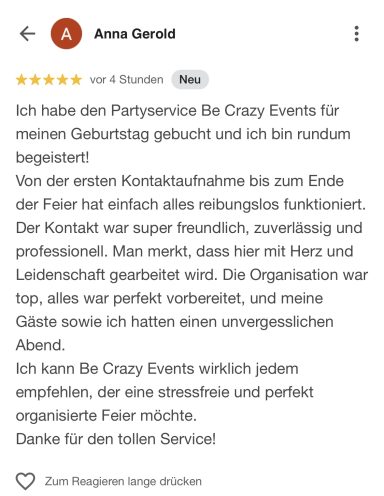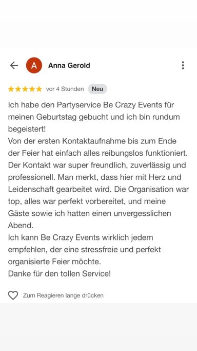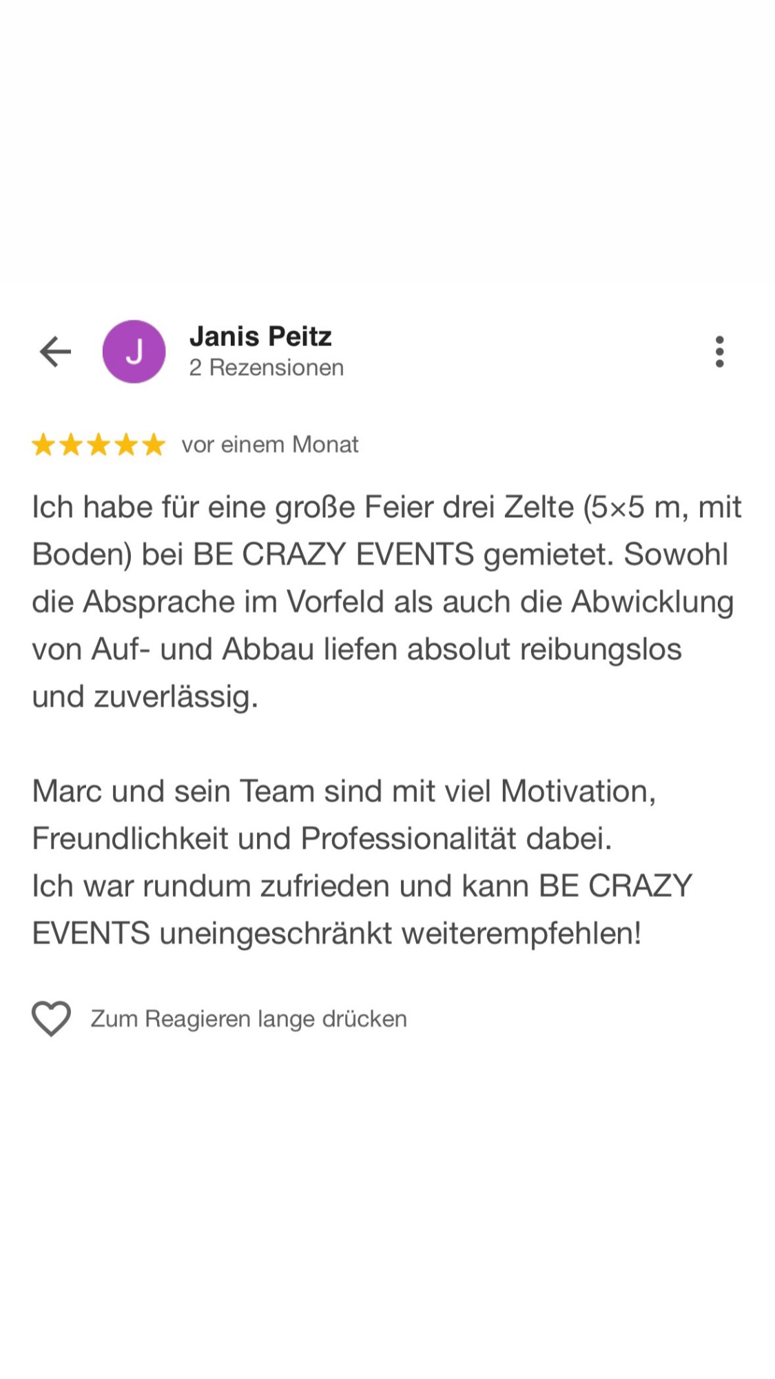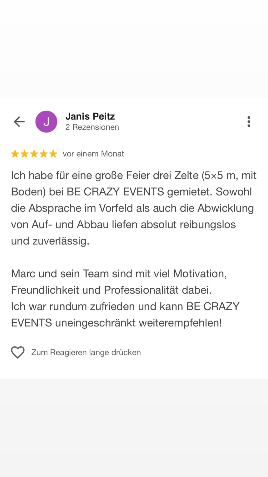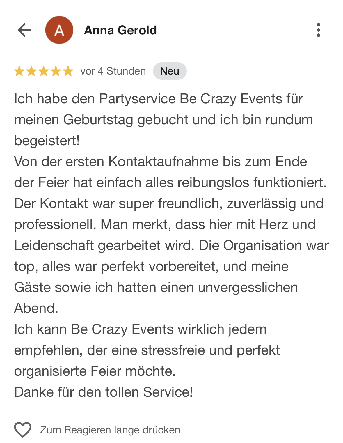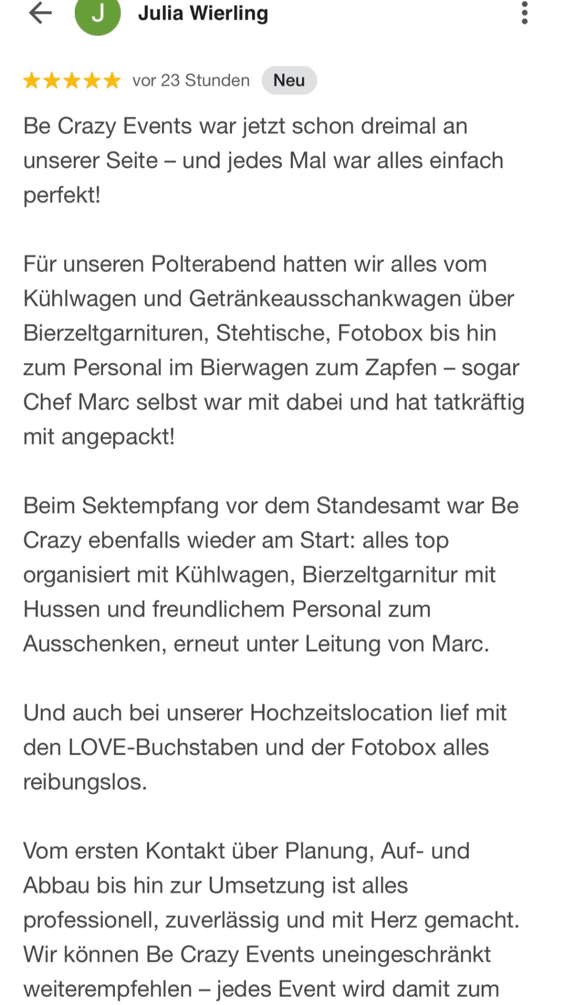 Erkunden Sie die neuesten Bewertungen über die Dienstleistungen von Be Crazy Events. Unsere Kunden teilen ihre Erfahrungen mit Zeltverleih, Cocktailbar und Partyausstattung. Durch das Feedback unserer geschätzten Klienten sind wir in der Lage, unsere Servicequalität kontinuierlich zu verbessern und Ihnen unvergessliche Erlebnisse zu bieten. Lesen Sie, was andere über unsere hochwertigen Zelte, unsere exquisite Cocktailbar und den umfassenden Partyausstattungsverleih sagen. Mit unserem professionellen Hochzeitsplaner-Team und der Eventmanagement-Firma stehen wir Ihnen zur Seite, um Ihre Veranstaltungen zu einem vollen Erfolg zu machen. Ihr Vertrauen und Ihre Zufriedenheit sind unser Antrieb!